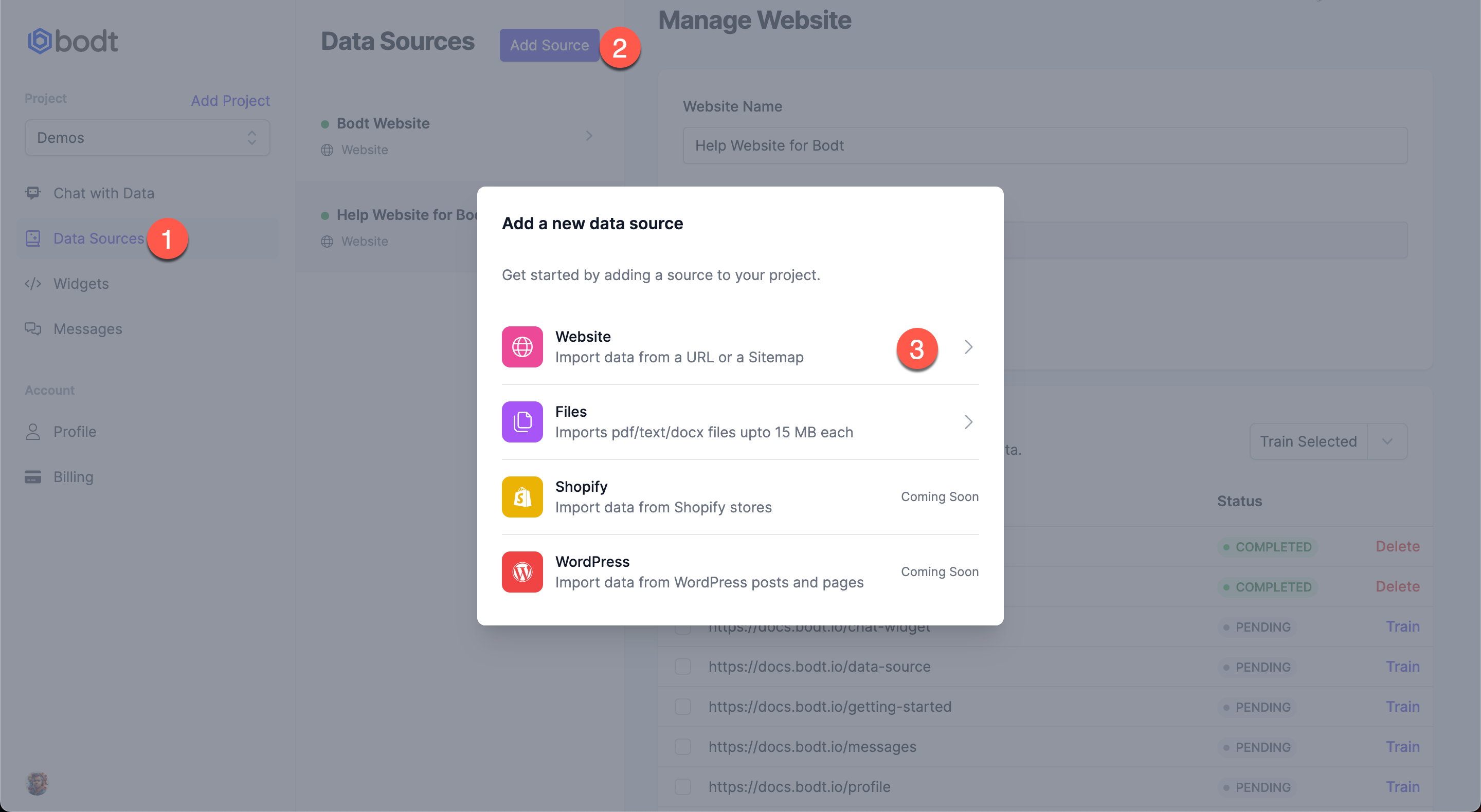 To add a new website source, navigate to the "Data Sources" sidebar and Click on "Add Source". Choose "Website" as the source and click on it